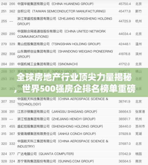 随着全球经济的发展,房地产行业一直是各国经济发展的重要支柱之一,在这个行业中,一些企业凭借卓越的经营实力和市场占有率,成为了行业的佼佼者,本文将根据最新的世界500强排名,揭示全球房地产行业的企业排名情况,带您了解全球房地产行业的顶尖力量。