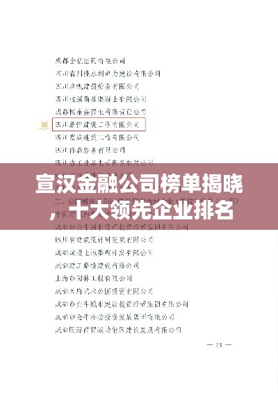 便是宣汉地区排名前十的金融公司,这些公司在金融服务领域表现出色,拥有广泛的客户基础和良好的口碑,随着金融行业的不断发展,这些公司将继续为客户提供更优质、更便捷的金融服务,推动宣汉地区的金融行业持续繁荣。