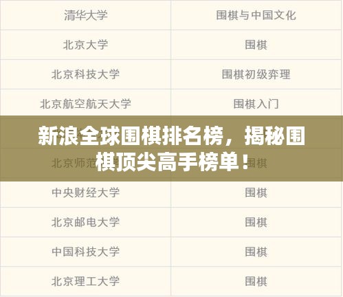围棋,一种源于中国的古老棋类游戏,如今已在全球范围内受到广泛欢迎,随着围棋的普及,世界各国的围棋高手不断涌现,为我们带来精彩的棋局,而在这其中,新浪世界围棋排名无疑是关注者们最为关注的话题之一,本文将为您揭示新浪世界围棋排名的背后故事,带您了解这些围棋界的顶尖高手。