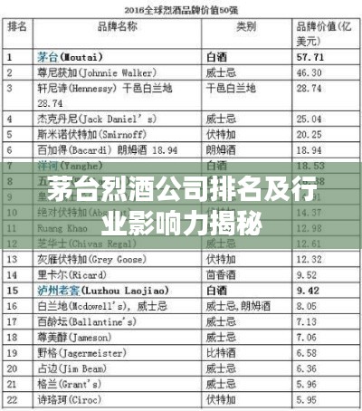 茅台烈酒公司,作为中国白酒行业的领军企业,一直备受关注,随着白酒市场的繁荣与发展,茅台烈酒公司的排名及其影响力也在不断提升,本文将从多个角度探讨茅台烈酒公司的排名及其在行业中的地位。